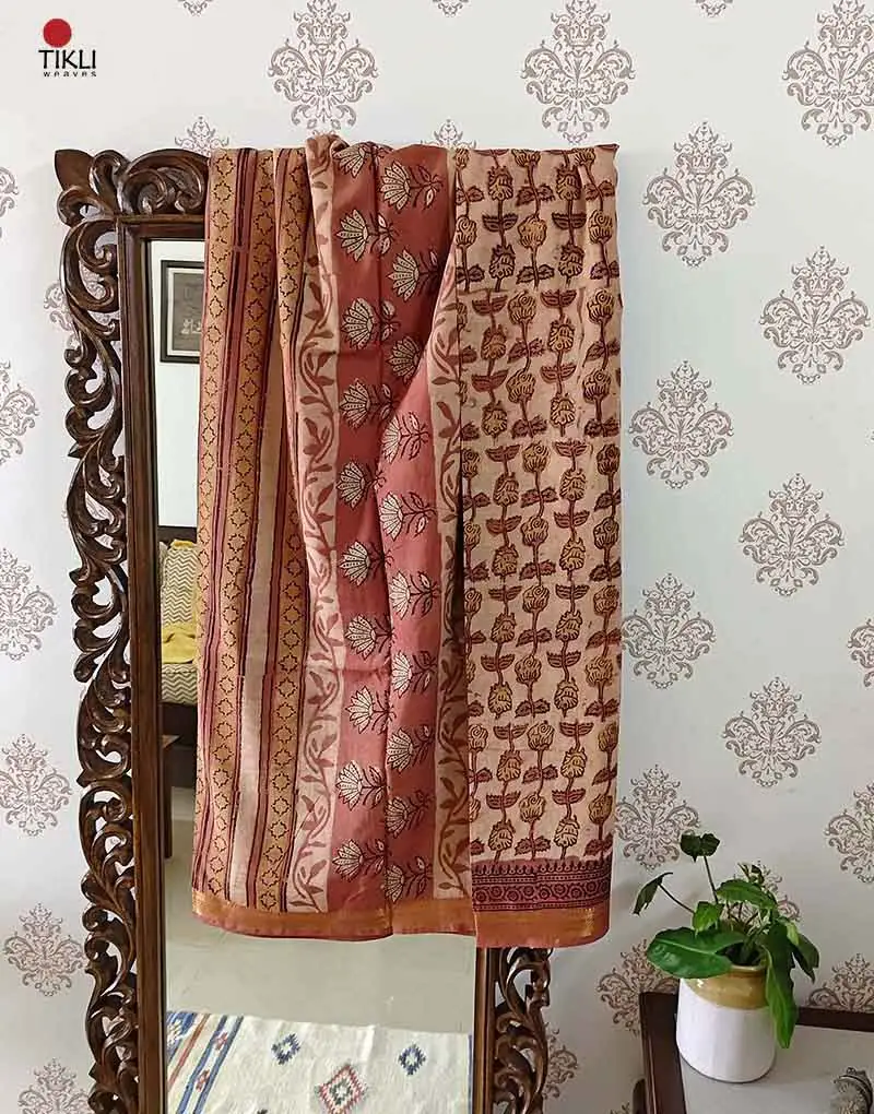 The Assam silk saree showcases stunning hand block prints featuring traditional bagru and vanaspati designs. Its attractive border and pallu make it ideal for various occasions such as weddings, parties, festivals, and evening wear.Â